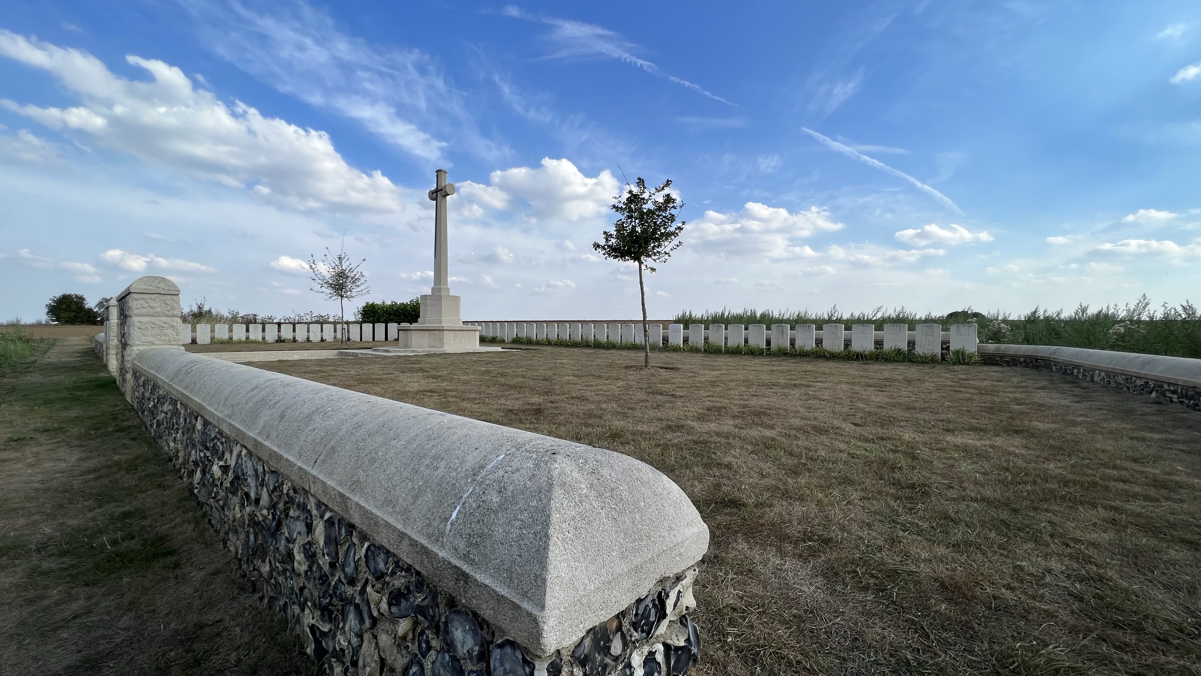 Hi Paul. Thanks for the latest podcast, fascinating as always. One thing I picked up on was the comment about the different font used in the early cemetery at Forceville, something that stood out quite sharply to us when we there last year. It also reminded me that Max Gill, who designed the lettering eventually adopted by the Commission, lost his brother, Kenneth in the war. Kenneth, killed when his aircraft crashed in October 1918, is buried in Fillievres Cemetery, his brothers work engraved on the headstone above his grave…